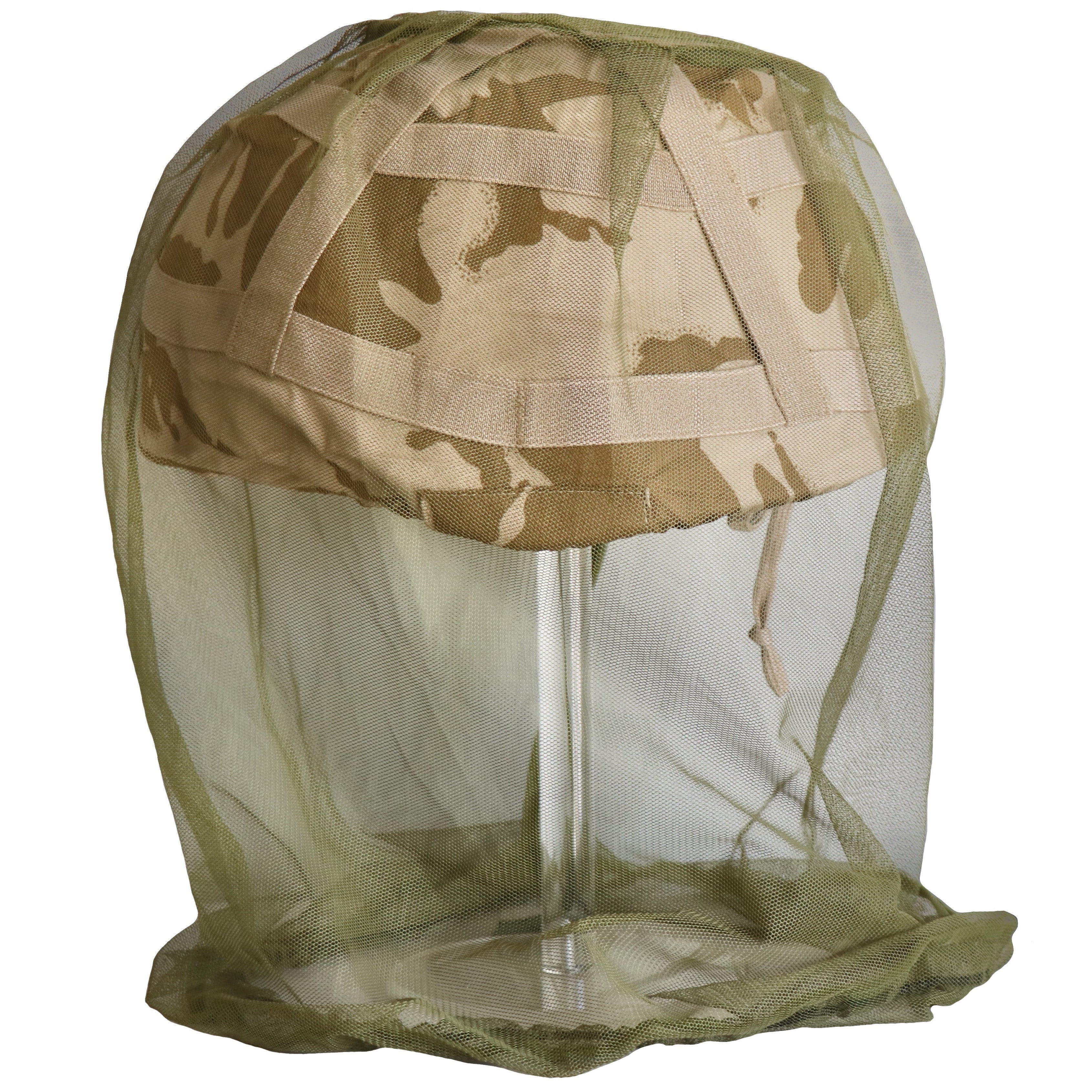 The British OD helmet mosquito net fits over the combat helmet and extends to cover the face and neck. It is secured with a drawcord.