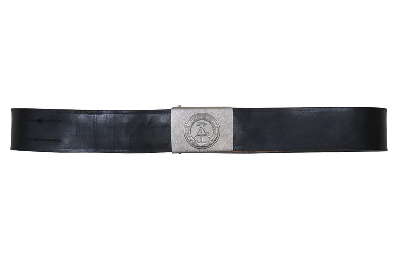 The East German Black Leather Army Belt and Buckle is a standard issue uniform belt designed for everyday wear by Nationale Volksarmee personnel. It provides a durable waist belt with a distinctive stamped metal buckle.