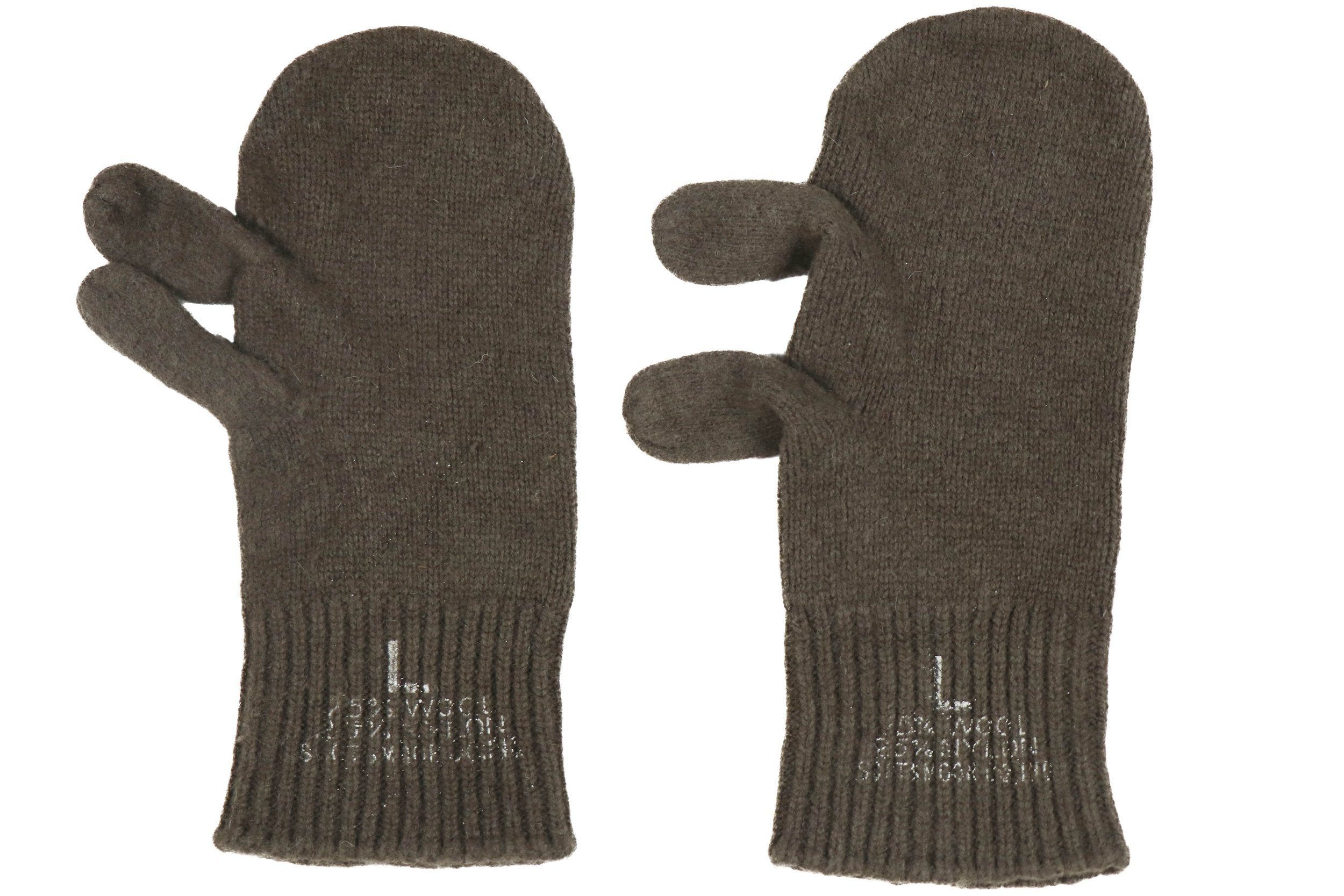 The US military OG-208 wool trigger finger mittens are insulating liners designed to be worn alone or inside leather outer shells. Their split-finger design allows for weapon handling in cold conditions.